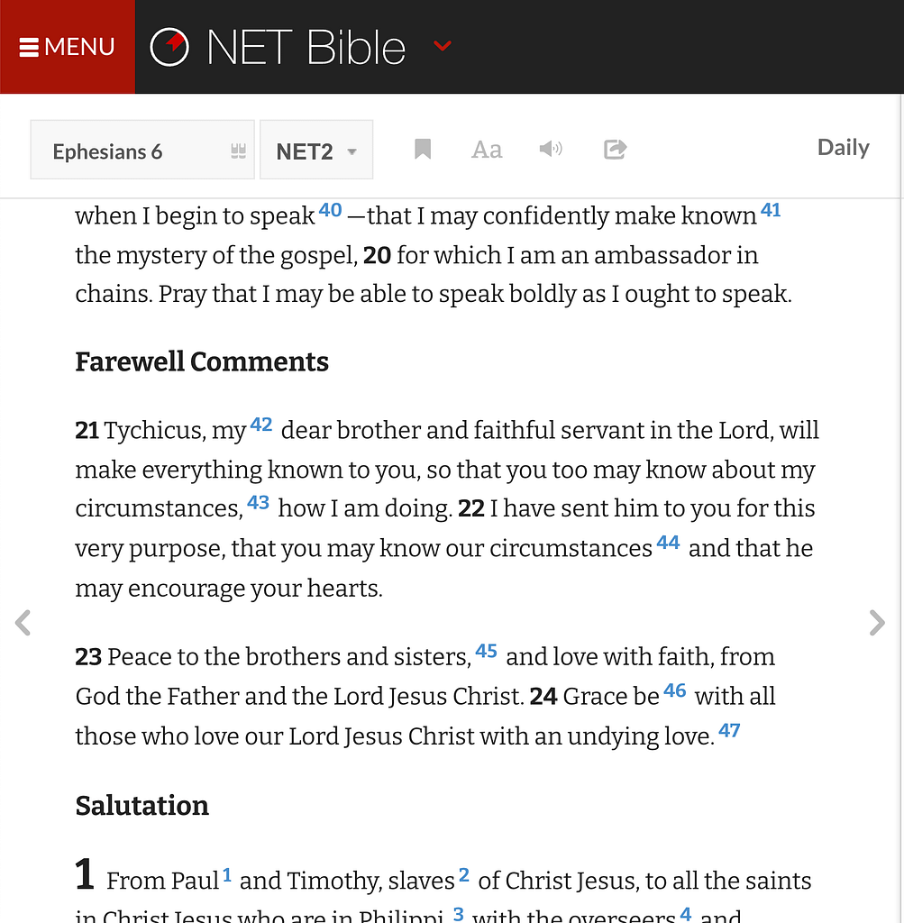 Die New English Translation (NET) ist eine relativ moderne Bibelübersetzung (2005, zuletzt revidiert 2019), die ihre Stärke nicht in der Wortgetreuheit findet (als reine Übersetzung ist sie eher wünschenswert), sondern in den mehr als 60.000 Fußnoten mit spannenden und nützlichen Erkenntnissen der Textkritik sowie ausführliche Worterklärungen. Für mich gehört sie zum Standardrepertoir im Bibelstudium.