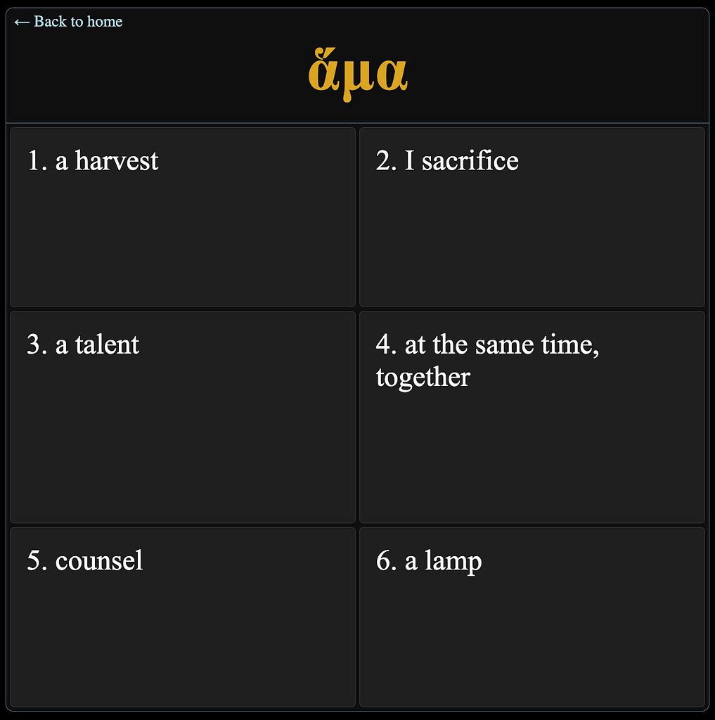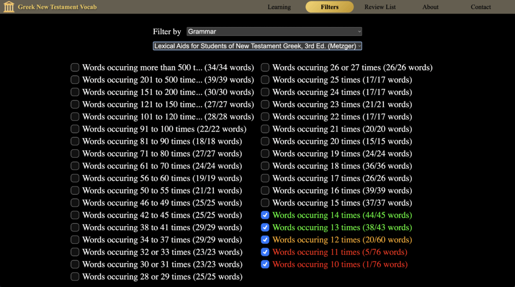 Es ist ein großer Segen, dass genau als ich begann, Griechisch zu lernen, ein ehemaliger Schüler von Daily Dose of Greek die Webseite Greek New Testament Vocab veröffentlichte. Diese enthält alle 5420 griechischen Vokabeln, die wir im Neuen Testament finden.