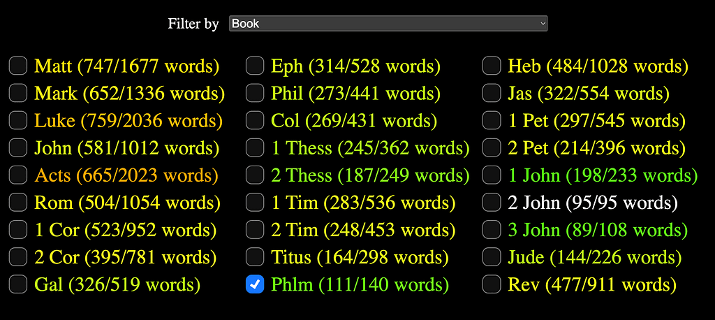 Die fast noch spannendere Option ist die Sortierung nach Bibelbuch, die man sogar bis aufs einzelne Kapitel beschränken kann. Wer also lernen möchte, die Bibel flüssig auf Griechisch zu lesen, kann so Kapitel für Kapitel vorgehen: