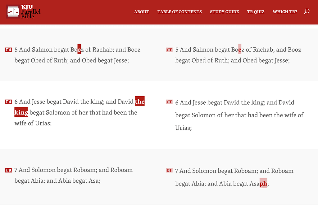 Um zu sehen, wie irrelevant selbst die nicht selten unterschiedlichen Grundlagen des Textus Receptus (TR) und dem „Critical Text“ (CT) sind, hilft es ungemein, jeweilige Übersetzungen des gesamten Neuen Testaments nebeneinander zu lesen.